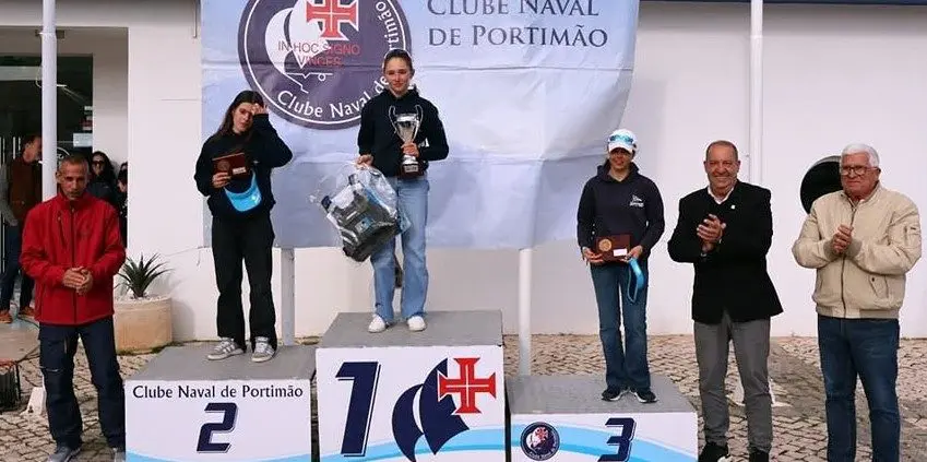 Maria Nunes, no pódio da Taça de Portugal de Optimist