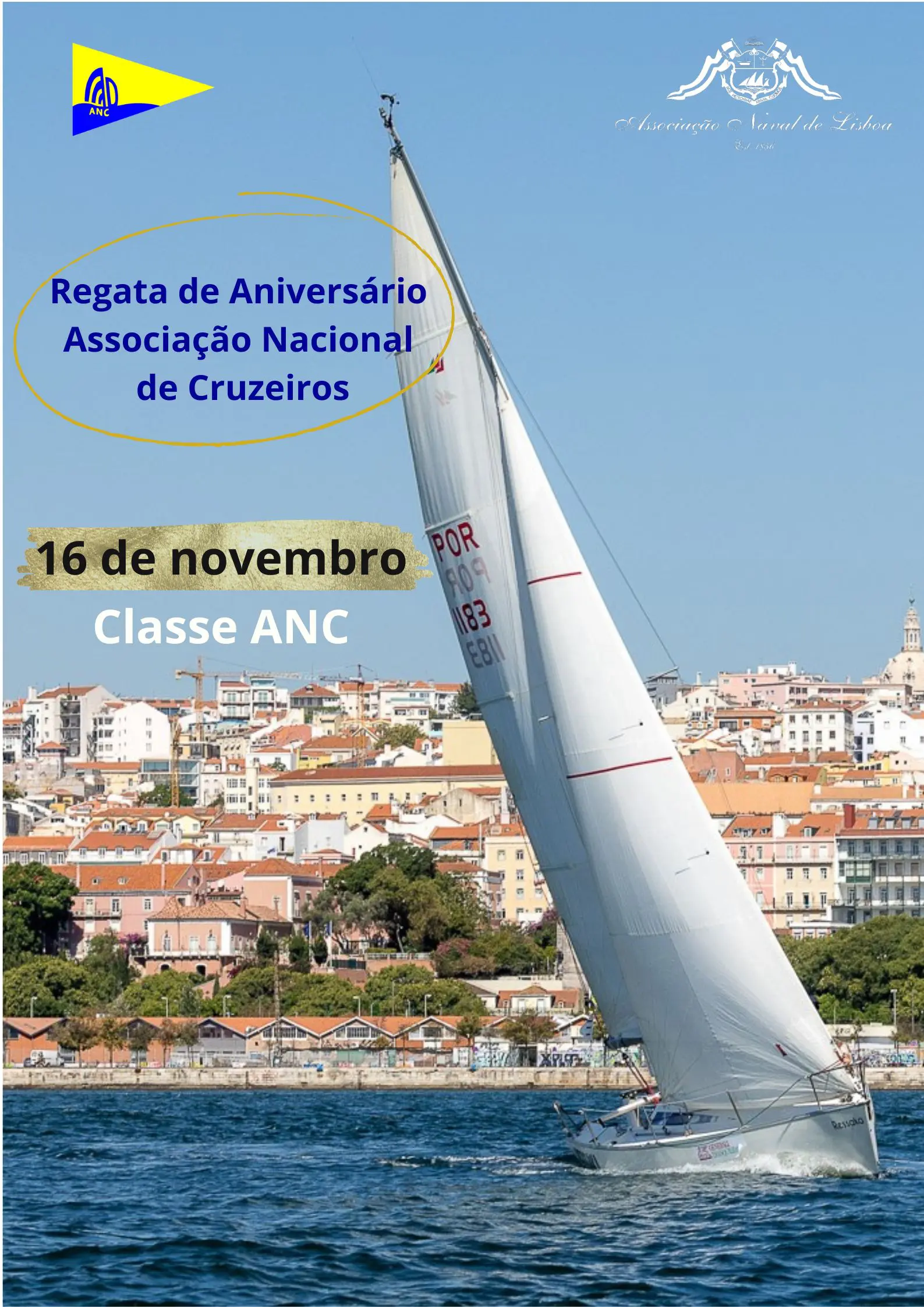 A Associação Naval de Lisboa (ANL) estabelece este Anúncio de Regata, para a realização da Regata Aniversário ANC 2024, promovida pela Associação Nacional de Cruzeiros ANC, para todos os barcos de cruzeiro, na classe ANC e que será disputada no dia 16 de Novembro de 2024, no campo de regata do Rio Tejo entre a ponte Vasco da Gama e o Farol do Bugio.