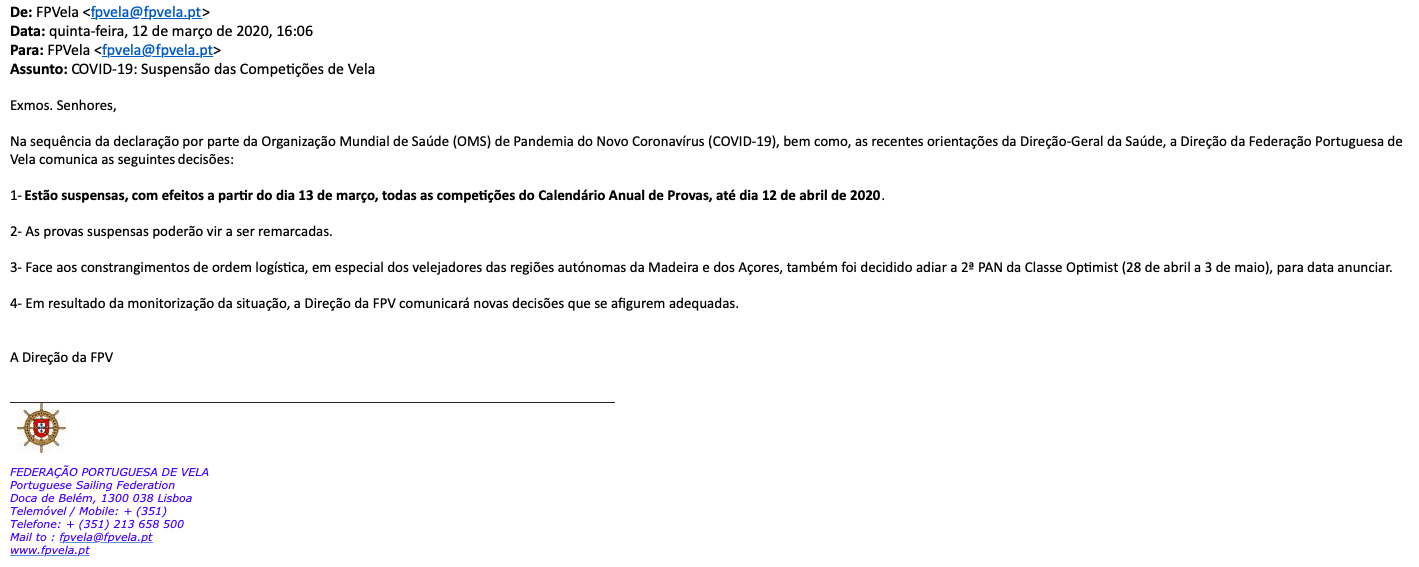 Na sequência do comunicado da Federação Portuguesa de Vela (em anexo), a Associação Naval de Lisboa informa que o Troféu Infante D. Henrique 2020 agendado para este domingo, irá ser CANCELADO.