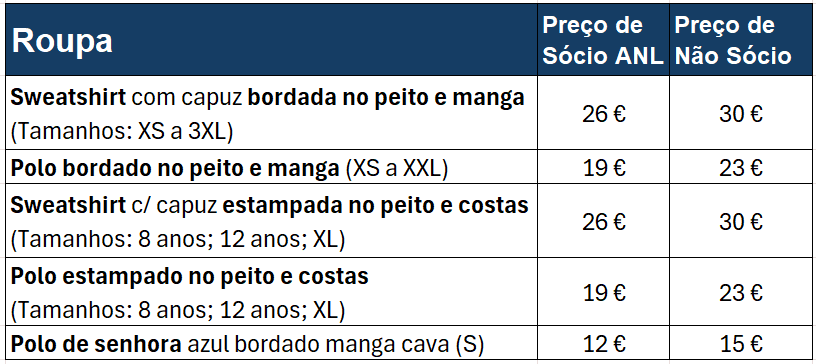 Polos e sweats personalizados com o logo da ANL estão à venda na ANL mas compra-os mais baratos se for sócio do clube.
